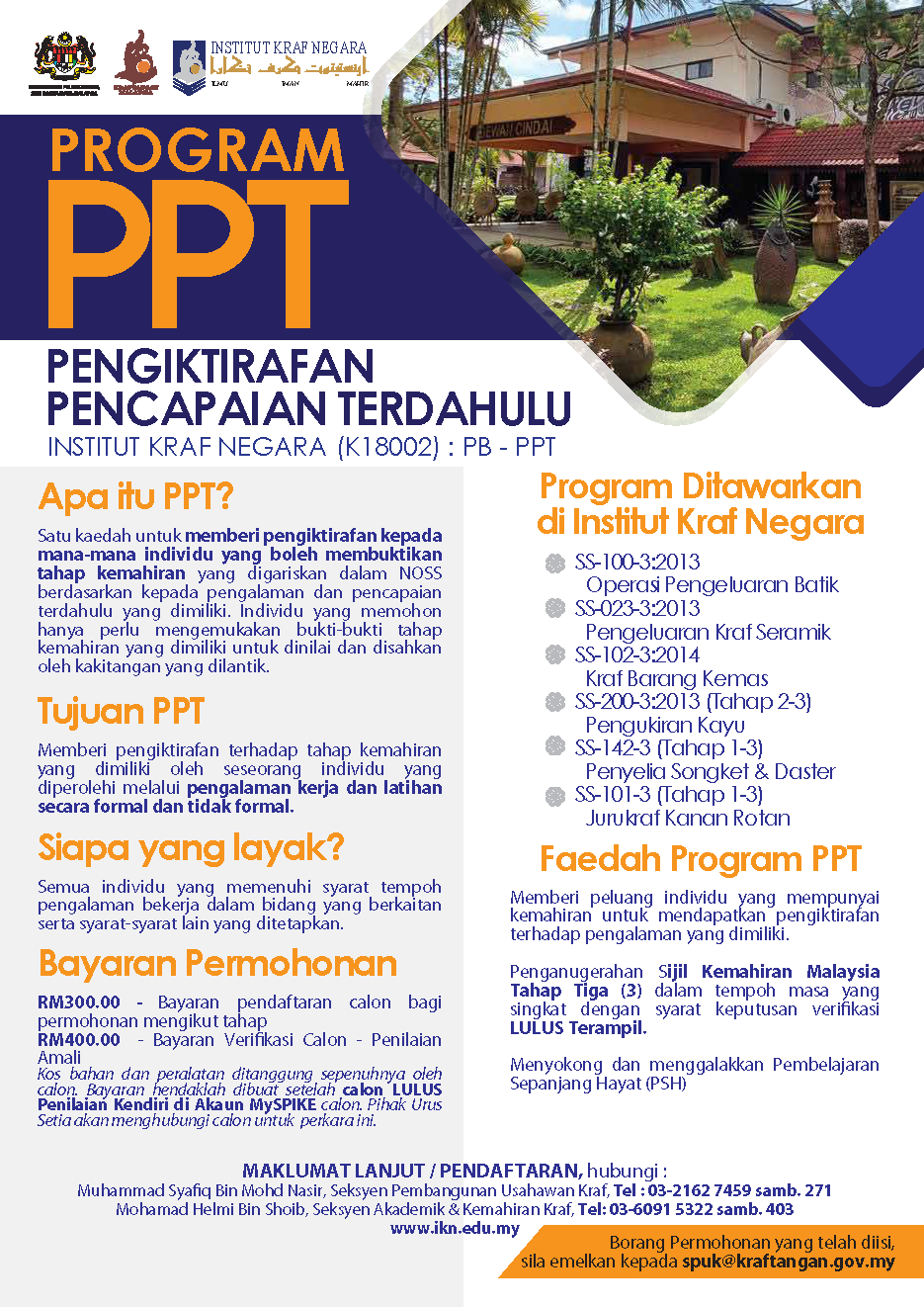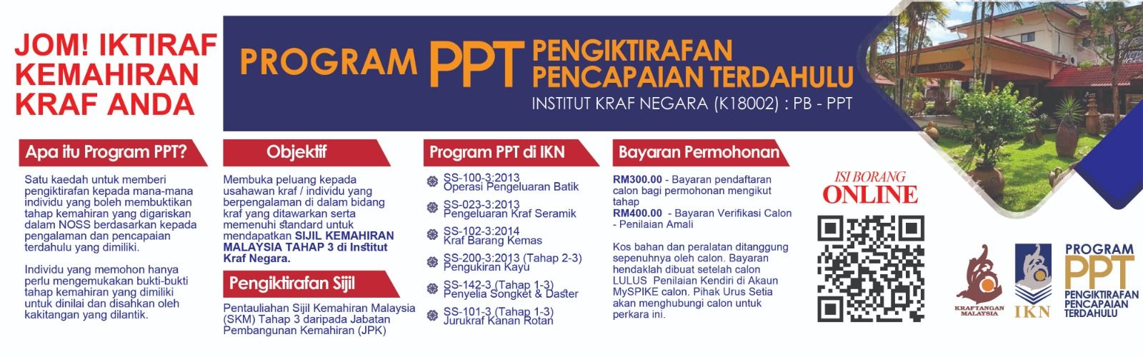Kraftangan Malaysia melalui Institut Kraf Negara mempelawa individu yang berkemahiran tetapi tiada pengiktirafan terhadap pengalaman yang dimiliki untuk memohon Program PPT iaitu Pengiktirafan Pencapaian Terdahulu ambilan Februari, Mei dan September 2024.